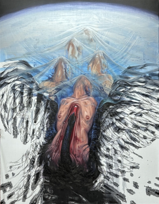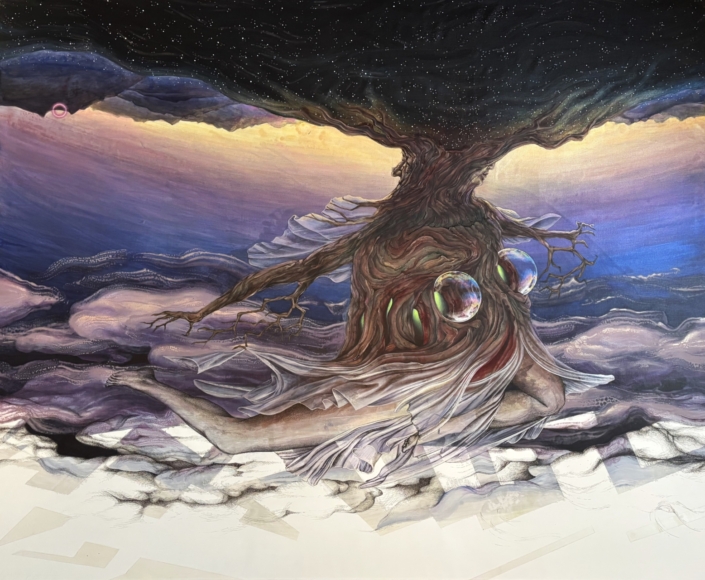 Der Traum des alten Baums, Windsbraut; 2025, 180 x 220 cm, Öl Acryl Interferenz phosphoriz., Tusche Leinen