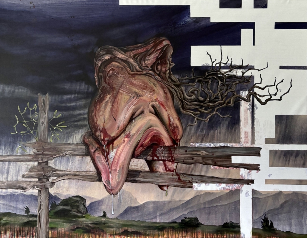Haupt, 2024, 220 x 180 cm, Öl Acryl phosphorisierend auf Leinen