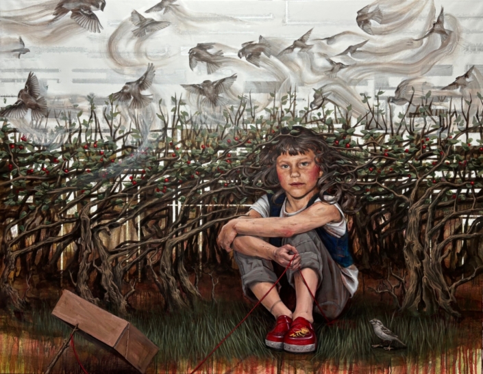 Heckensitzerin, 2025, 140 x 160 cm, Öl Aryl auf Leinen